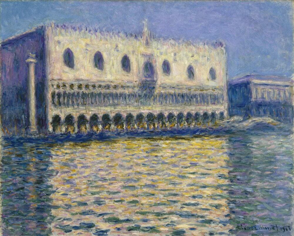 In Venice, Monet began each day with views such as this one, showing the airy façade of the Doge’s Palace from across the water on the islet of San Giorgio Maggiore. Monet Monet departed Venice reluctantly, writing